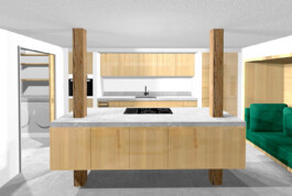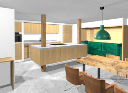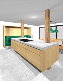 Materials such as oak, concrete for the worktops and dark green velvet fabric for the surface of the seatings